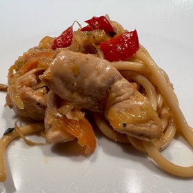 Die Nudeln abgießen und unter die Hähnchen-Gemüse-Mischung mischen.