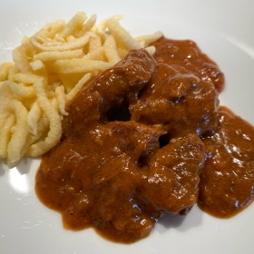Als Gulasch passen Nudeln, Spätzle oder Kartoffelklöße dazu.