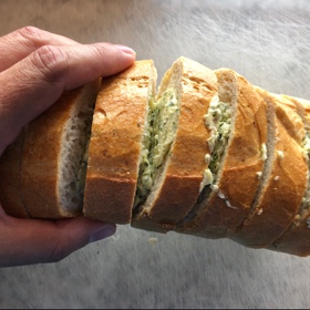Das frische Brot halbieren und dann so in Scheiben schneiden, das die Scheiben unten noch zusammenhängen. Also nicht ganz durchschneiden.