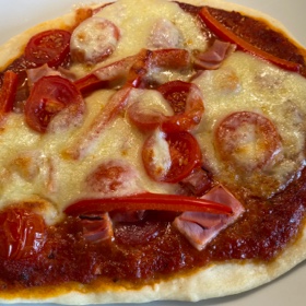 Den Pizzateig mit der Tomatensauce bestreichen und nach Belieben belegen.
