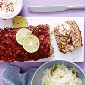 Mit Salz und Pfeffer kräftig würzen. Hackmasse in eine geölte Kastenform (ca. 25 cm Länge) geben, glatt streichen und im heißen Ofen ca. 1 Stunde backen.