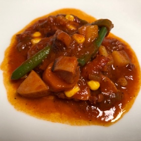 Die Zwiebeln, Fleischwurst, Paprika, Kartoffeln und Karotten in beliebige Form klein schneiden.